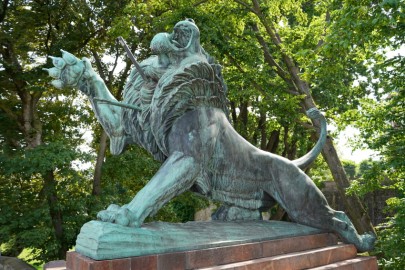 Entworfen wurde die Löwenstatue vom Bildhauer Heinrich Jobst (1874–1943), der 1907 an die Darmstädter Künstlerkolonie berufen worden war und auf der Mathildenhöhe sein Atelier besaß. Gefertigt wurde die Statue von der Firma Brandstetter in München.